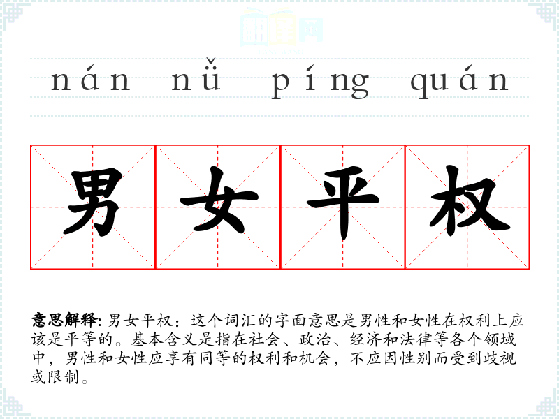 男女平权:这个词汇的字面意思是男性和女性在权利上应该是平等的。基本含义是指在社会、政治、经济和法律等各个领域中,男性和女性应享有同等的权利和机会,不应因性别而受到歧视或限制。