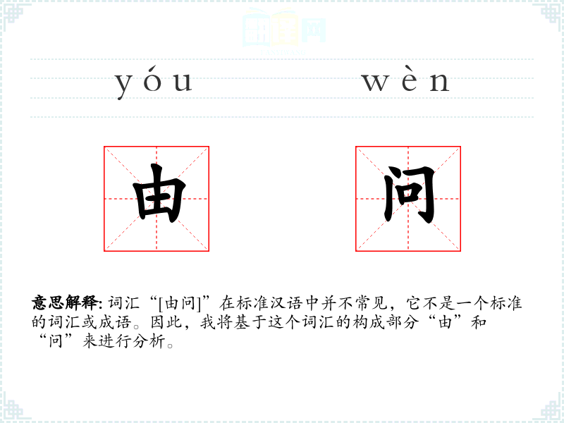 词汇“[由问]”在标准汉语中并不常见,它不是一个标准的词汇或成语。因此,我将基于这个词汇的构成部分“由”和“问”来进行分析。
