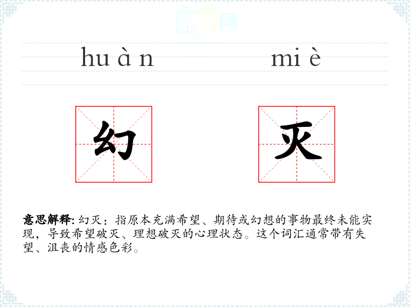 幻灭:指原本充满希望、期待或幻想的事物最终未能实现,导致希望破灭、理想破灭的心理状态。这个词汇通常带有失望、沮丧的情感色彩。
