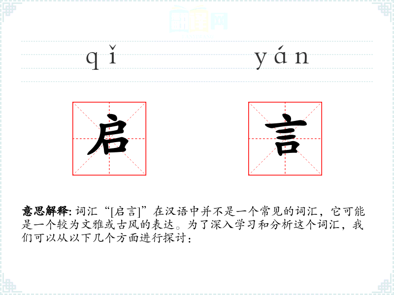 词汇“[启言]”在汉语中并不是一个常见的词汇,它可能是一个较为文雅或古风的表达。为了深入学*和分析这个词汇,我们可以从以下几个方面进行探讨: