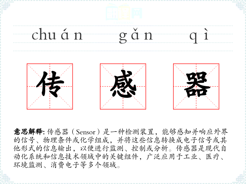 - 同义词:探测器(Detector)、感应器(Transducer)、检测器(Indicator)。这些词汇在某些上下文中可以互换使用,但“传感器”更侧重于感知和转换信号的能力。