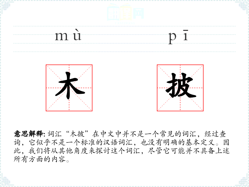 由于“木披”不是一个标准词汇,我们无法提供一个确切的基本定义。它可能是某个方言词汇,或者是某个特定行业或社群中的术语。