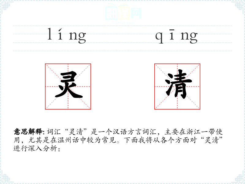 词汇“灵清”是一个汉语方言词汇,主要在浙江一带使用,尤其是在温州话中较为常见。下面我将从各个方面对“灵清”进行深入分析: