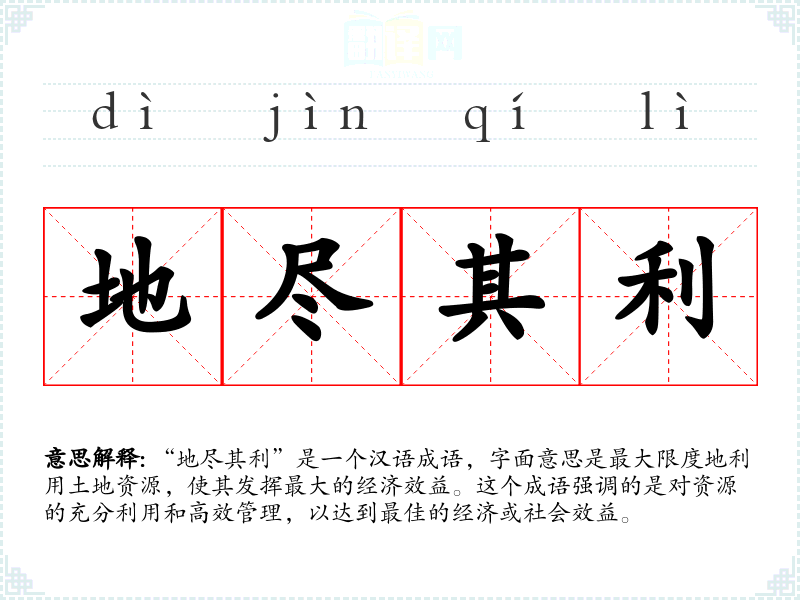“地尽其利”是一个汉语成语,字面意思是最大限度地利用土地资源,使其发挥最大的经济效益。这个成语强调的是对资源的充分利用和高效管理,以达到最佳的经济或社会效益。