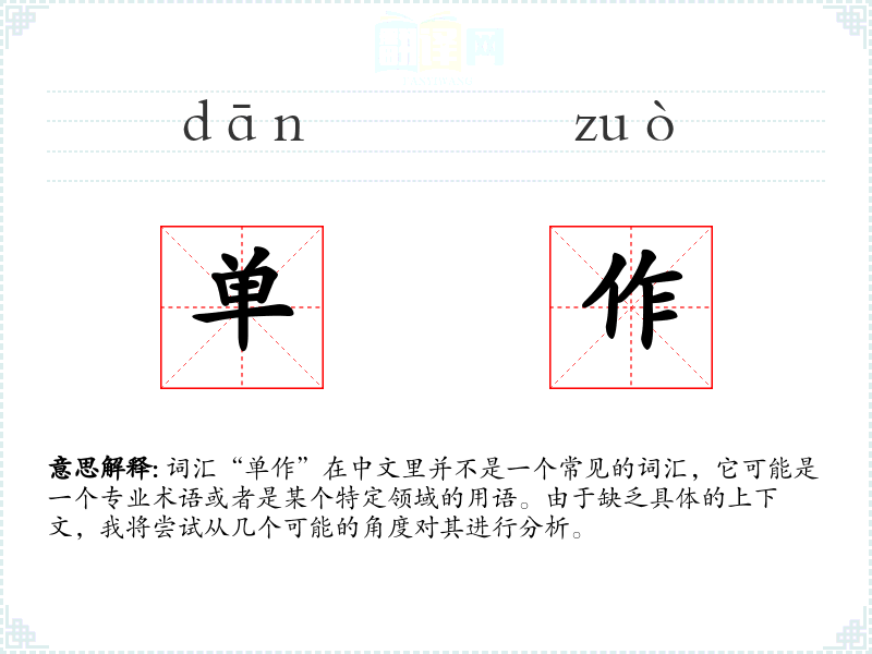 词汇“单作”在中文里并不是一个常见的词汇,它可能是一个专业术语或者是某个特定领域的用语。由于缺乏具体的上下文,我将尝试从几个可能的角度对其进行分析。