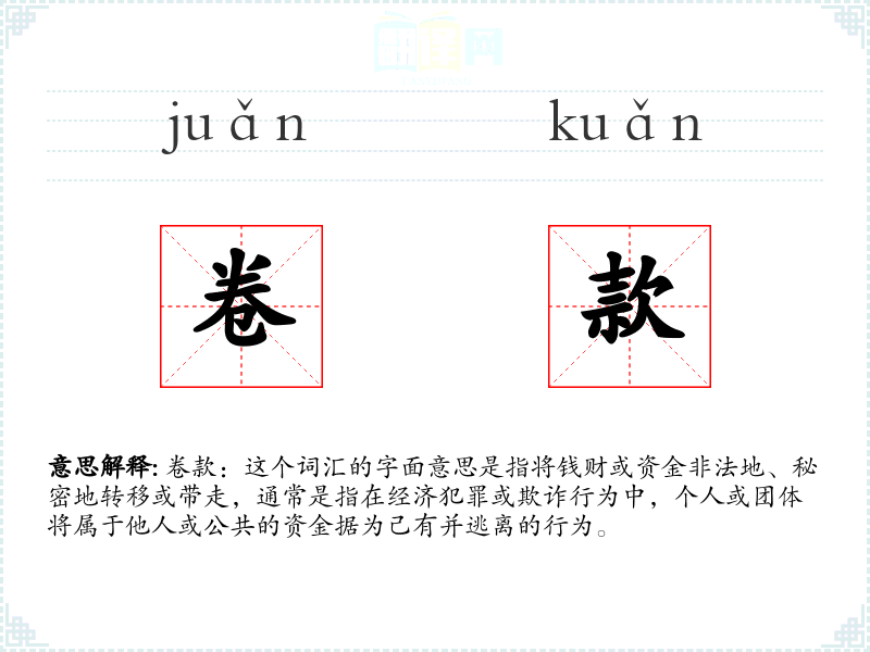 卷款:这个词汇的字面意思是指将钱财或资金非法地、秘密地转移或带走,通常是指在经济犯罪或欺诈行为中,个人或团体将属于他人或公共的资金据为己有并逃离的行为。