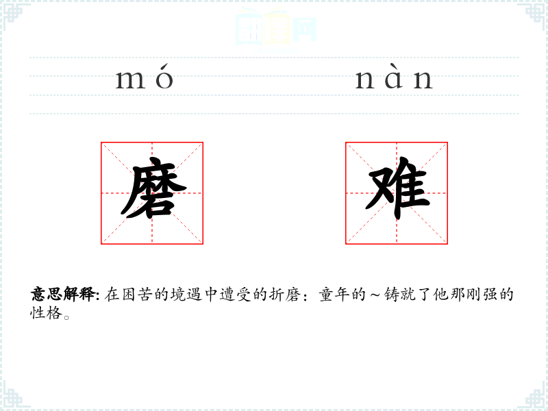 在困苦的境遇中遭受的折磨:童年的~铸就了他那刚强的性格。