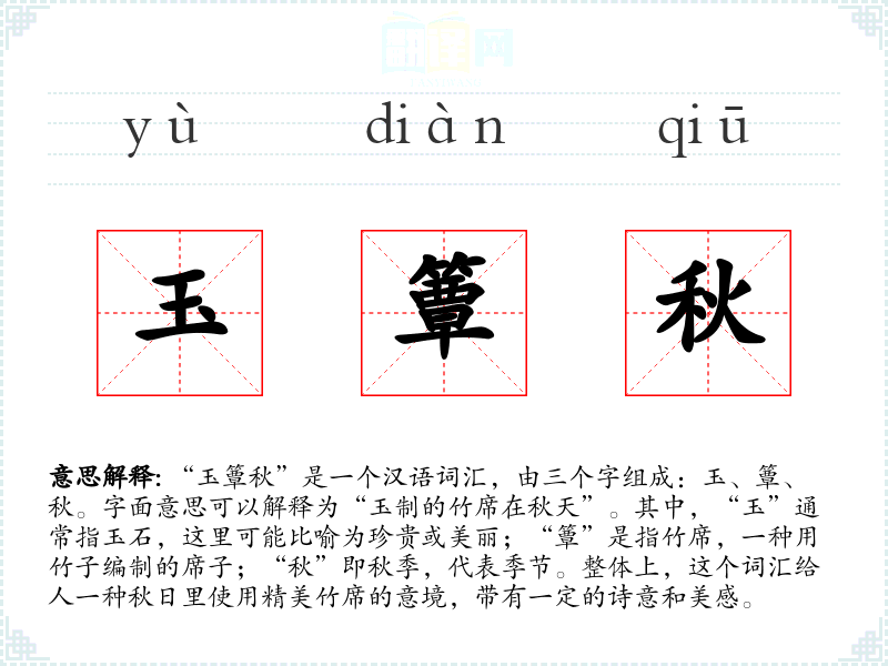 “玉簟秋”是一个汉语词汇,由三个字组成:玉、簟、秋。字面意思可以解释为“玉制的竹席在秋天”。其中,“玉”通常指玉石,这里可能比喻为珍贵或美丽;“簟”是指竹席,一种用竹子编制的席子;“秋”即秋季,代表季节。整体上,这个词汇给人一种秋日里使用精美竹席的意境,带有一定的诗意和美感。