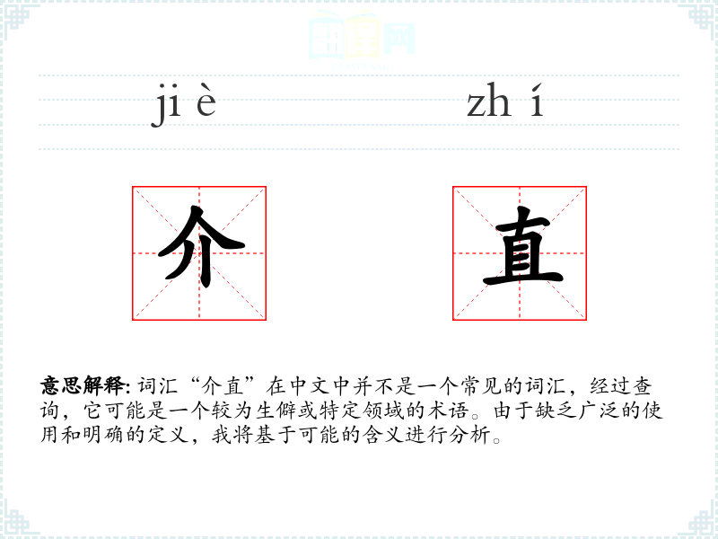 词汇“介直”在中文中并不是一个常见的词汇,经过查询,它可能是一个较为生僻或特定领域的术语。由于缺乏广泛的使用和明确的定义,我将基于可能的含义进行分析。