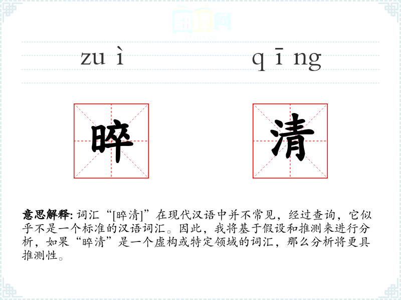 由于“晬清”不是一个标准词汇,我们无法给出确切的字面意思和基本含义。如果假设它是一个形容词,可能意味着“清澈”、“纯净”或“清晰”。