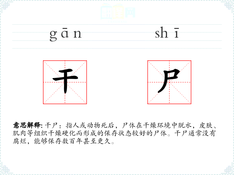 干尸:指人或动物死后,尸体在干燥环境中脱水,皮肤、肌肉等组织干燥硬化而形成的保存状态较好的尸体。干尸通常没有腐烂,能够保存数百年甚至更久。