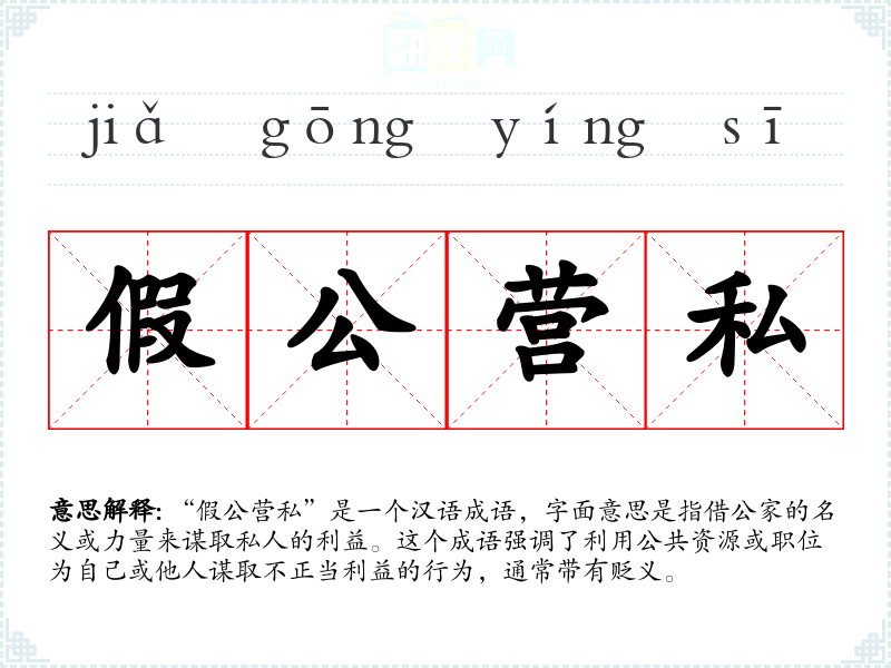 “假公营私”是一个汉语成语,字面意思是指借公家的名义或力量来谋取私人的利益。这个成语强调了利用公共资源或职位为自己或他人谋取不正当利益的行为,通常带有贬义。