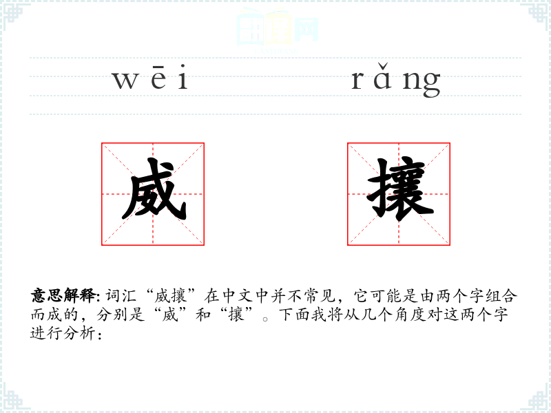 - 在其他语言中,如英语,可能没有直接对应的词汇,但概念可以通过组合词来表达,如“威”可以用“awe-inspiring”来描述,“攘”可以用“repel”来表达。