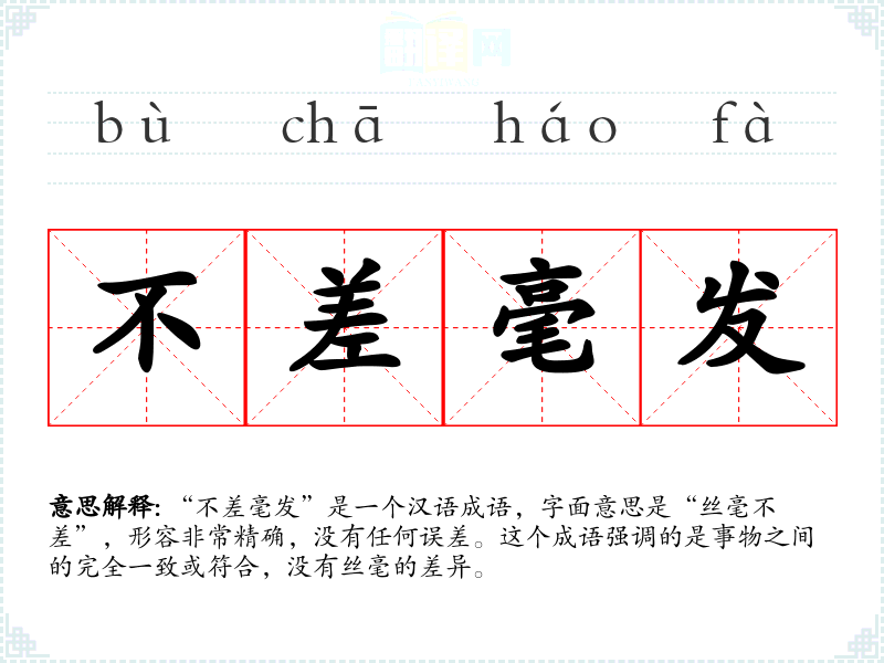 “不差毫发”是一个汉语成语,字面意思是“丝毫不差”,形容非常精确,没有任何误差。这个成语强调的是事物之间的完全一致或符合,没有丝毫的差异。