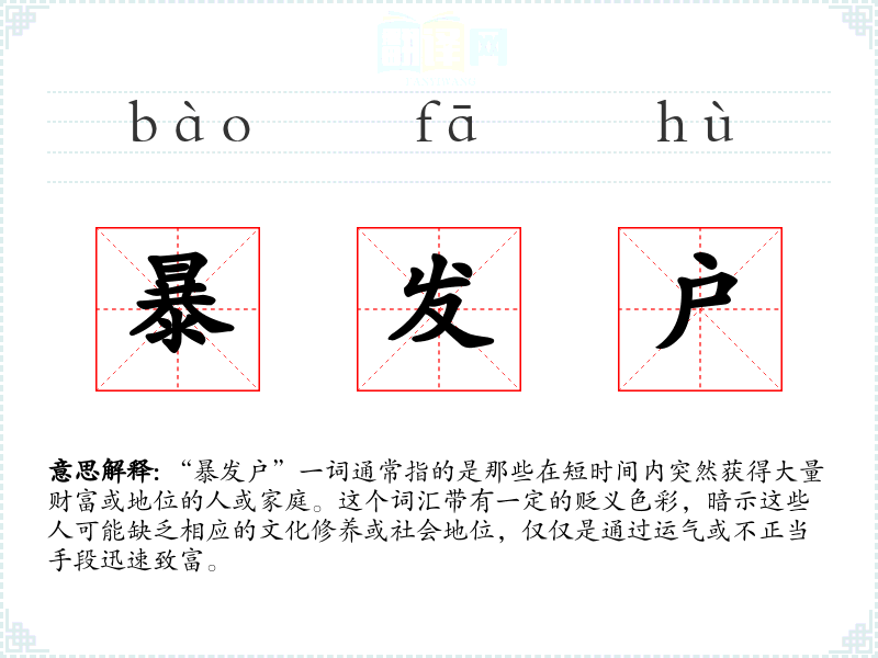 “暴发户”一词源于汉语,字面意思是“突然爆发的家庭”。随着社会经济的发展,这个词汇逐渐被用来形容那些通过非传统或不正当手段迅速获得财富的人。