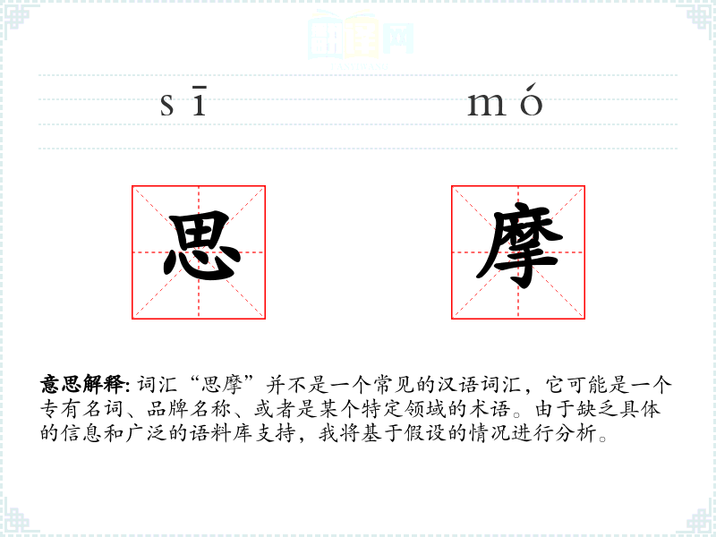 词汇“思摩”并不是一个常见的汉语词汇,它可能是一个专有名词、品牌名称、或者是某个特定领域的术语。由于缺乏具体的信息和广泛的语料库支持,我将基于假设的情况进行分析。