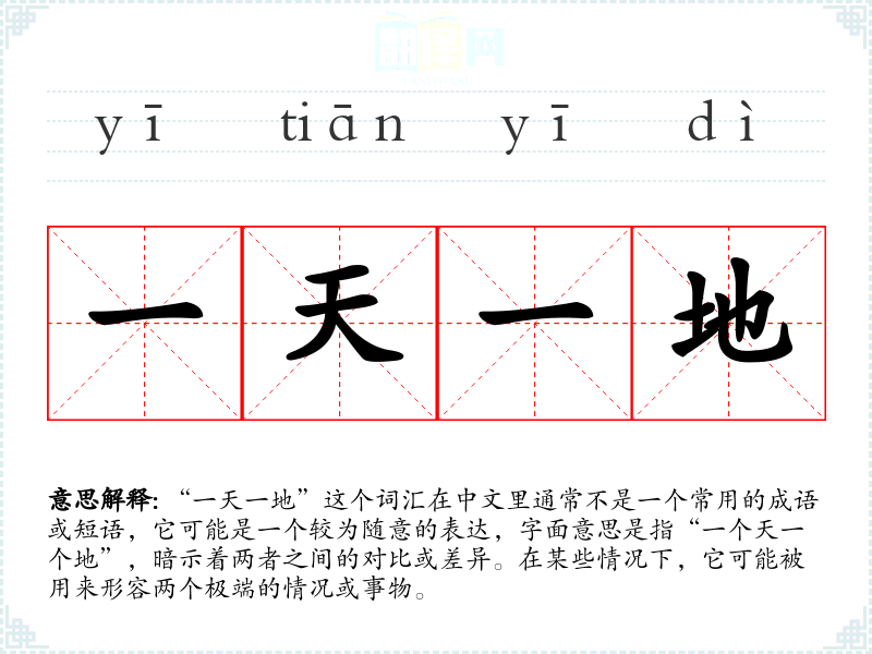 “一天一地”这个词汇虽然不是一个常用短语,但它简洁地表达了极端的对比或差异,具有一定的表现力和灵活性。在语言学习和表达中,了解和掌握这样的词汇可以帮助我们更准确和生动地传达思想和情感。