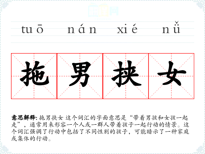 拖男挟女 这个词汇的字面意思是“带着男孩和女孩一起走”,通常用来形容一个人或一群人带着孩子一起行动的情景。这个词汇强调了行动中包括了不同性别的孩子,可能暗示了一种家庭或集体的行动。