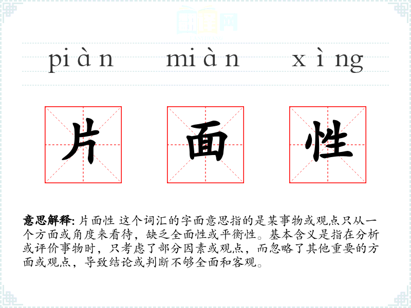 “片面性”一词源于汉语,由“片面”和“性”组成。在古代汉语中,“片面”指的是单一方面,而“性”则表示性质或特性。随着语言的发展,“片面性”逐渐被用来描述观点或分析的不全面性。