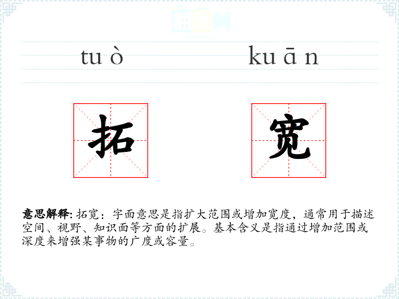 - 专业领域:在商业或工程领域,“拓宽”可能指扩大市场或增加产品的宽度,如“公司计划拓宽其产品线”。