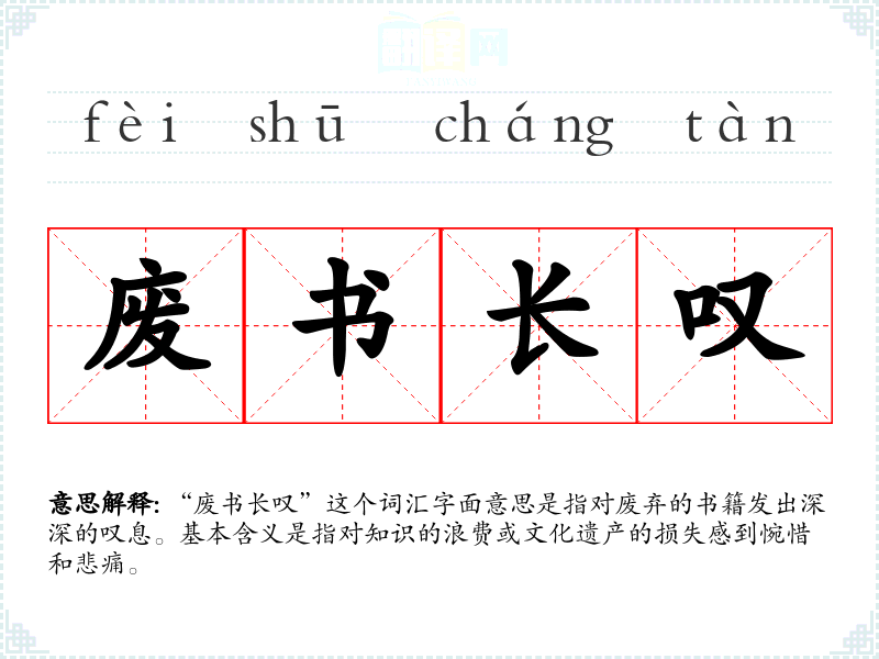 “废书长叹”这个词汇可能源自古代文人对书籍保存和知识传承的重视。随着时间的推移,这个词汇逐渐被用来表达更广泛的情感,包括对文化遗产和个人才能的惋惜。