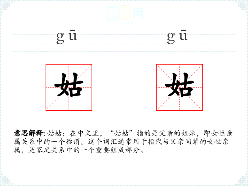 姑姑:在中文里,“姑姑”指的是父亲的姐妹,即女性亲属关系中的一个称谓。这个词汇通常用于指代与父亲同辈的女性亲属,是家庭关系中的一个重要组成部分。