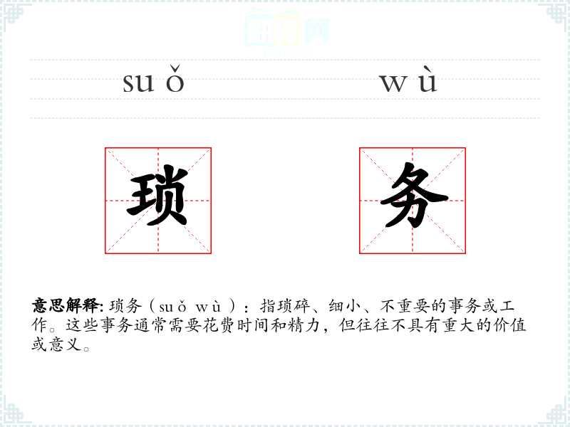 琐务(suǒ wù):指琐碎、细小、不重要的事务或工作。这些事务通常需要花费时间和精力,但往往不具有重大的价值或意义。
