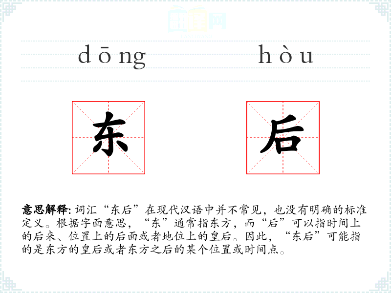 - 总结:“东后”是一个具有历史和文化背景的词汇,虽然在现代汉语中不常见,但在特定的语境中仍然有其独特的意义和价值。