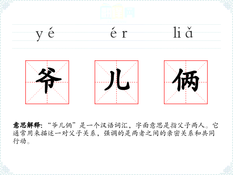 “爷儿俩”这个词汇的词源较为简单,由“爷”(指父亲)和“儿”(指儿子)以及表示复数的“俩”组成。在汉语中,这种组合形式常见于口语和非正式文本中,用以表达亲密和日常的父子关系。