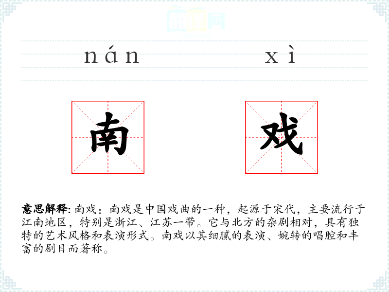 同义词:昆曲(南戏的一种,尤其指江苏昆山的昆曲) 反义词:北杂剧(与南戏相对,主要流行于**北方)