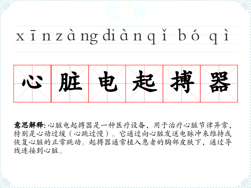 心脏电起搏器这个词由“心脏”、“电”和“起搏器”三个部分组成。“心脏”指的是人体的重要器官,“电”指的是使用电能,“起搏器”指的是一种能够启动或调节节奏的设备。这个词的现代使用始于20世纪50年代,随着医疗技术的进步而逐渐普及。