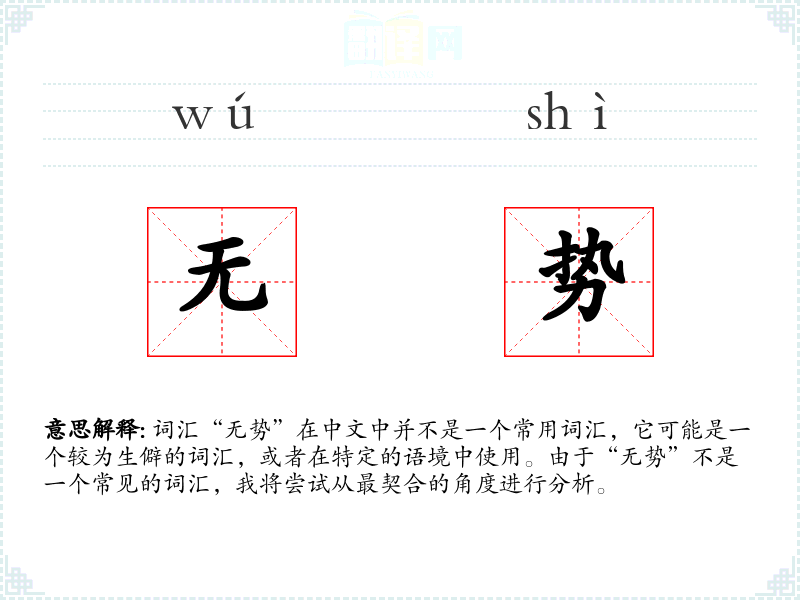 词汇“无势”在中文中并不是一个常用词汇,它可能是一个较为生僻的词汇,或者在特定的语境中使用。由于“无势”不是一个常见的词汇,我将尝试从最契合的角度进行分析。