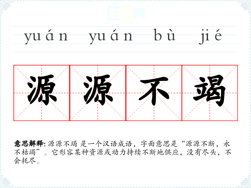 源源不竭 是一个汉语成语,字面意思是“源源不断,永不枯竭”。它形容某种资源或动力持续不断地供应,没有尽头,不会耗尽。