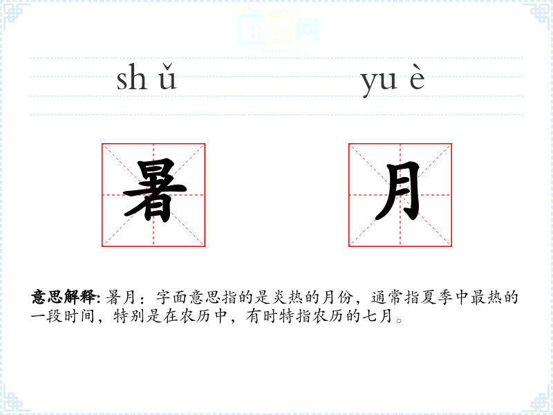 暑月:字面意思指的是炎热的月份,通常指夏季中最热的一段时间,特别是在农历中,有时特指农历的七月。