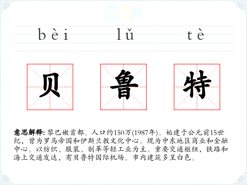 1.黎巴嫩首都。人口约150万(1987年)。始建于公元前15世纪,曾为罗马帝国和伊斯兰教文化中心。现为中东地区商业和金融中心。以纺织、服装、制革等轻工业为主。重要交通枢纽,铁路和海上交通发达,有贝鲁特国际机场。市内建筑多呈白色。