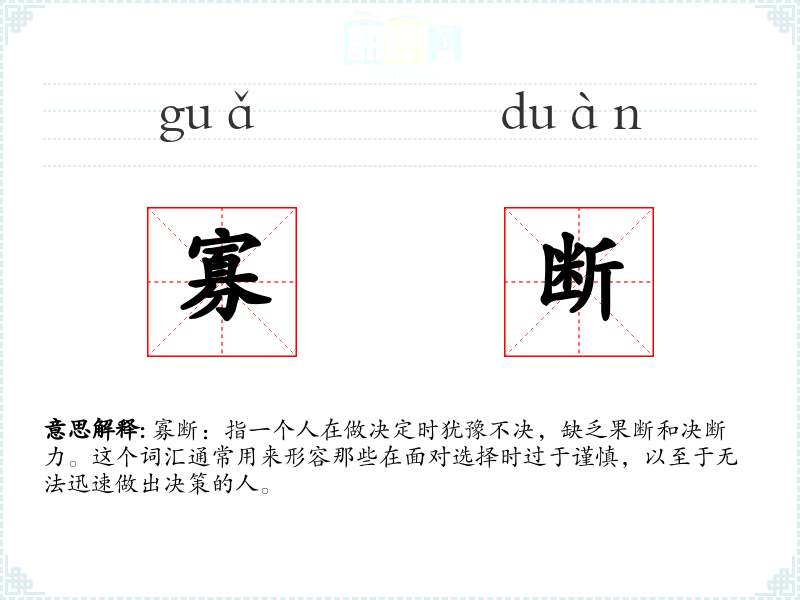 寡断:指一个人在做决定时犹豫不决,缺乏果断和决断力。这个词汇通常用来形容那些在面对选择时过于谨慎,以至于无法迅速做出决策的人。