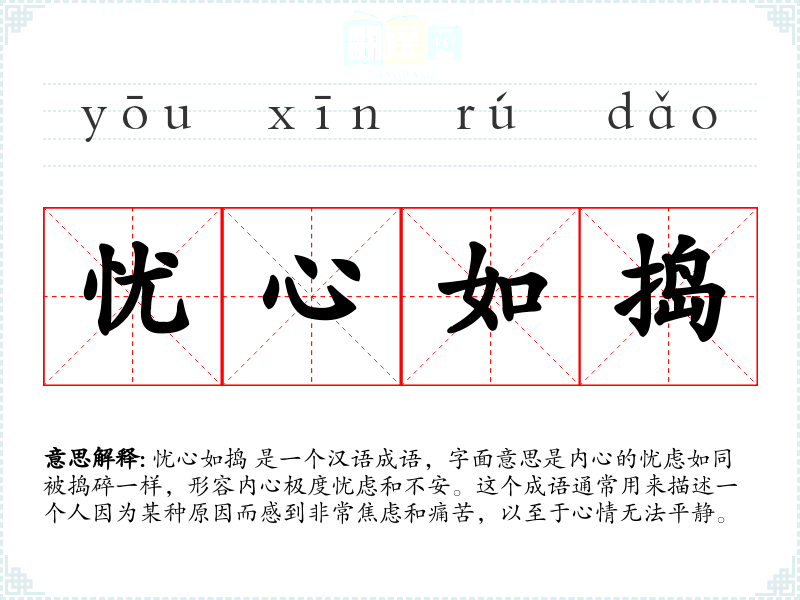 忧心如捣 是一个汉语成语,字面意思是内心的忧虑如同被捣碎一样,形容内心极度忧虑和不安。这个成语通常用来描述一个人因为某种原因而感到非常焦虑和痛苦,以至于心情无法平静。
