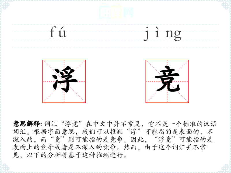 词汇“浮竞”在中文中并不常见,它不是一个标准的汉语词汇。根据字面意思,我们可以推测“浮”可能指的是表面的、不深入的,而“竞”则可能指的是竞争。因此,“浮竞”可能指的是表面上的竞争或者是不深入的竞争。然而,由于这个词汇并不常见,以下的分析将基于这种推测进行。