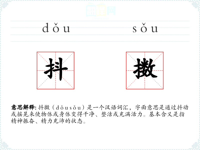 抖擞(dǒu sǒu)是一个汉语词汇,字面意思是通过抖动或摇晃来使物体或身体变得干净、整洁或充满活力。基本含义是指精神振奋、精力充沛的状态。