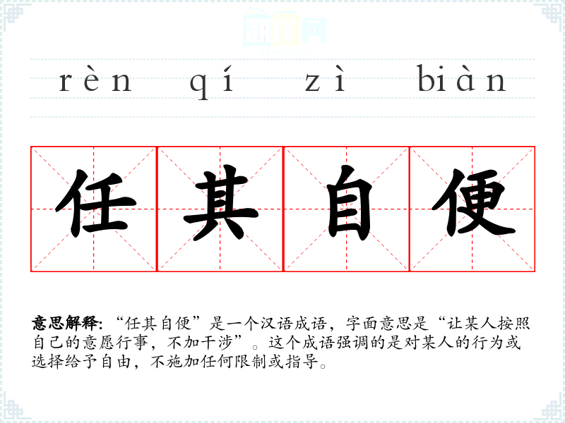 “任其自便”是一个汉语成语,字面意思是“让某人按照自己的意愿行事,不加干涉”。这个成语强调的是对某人的行为或选择给予自由,不施加任何限制或指导。