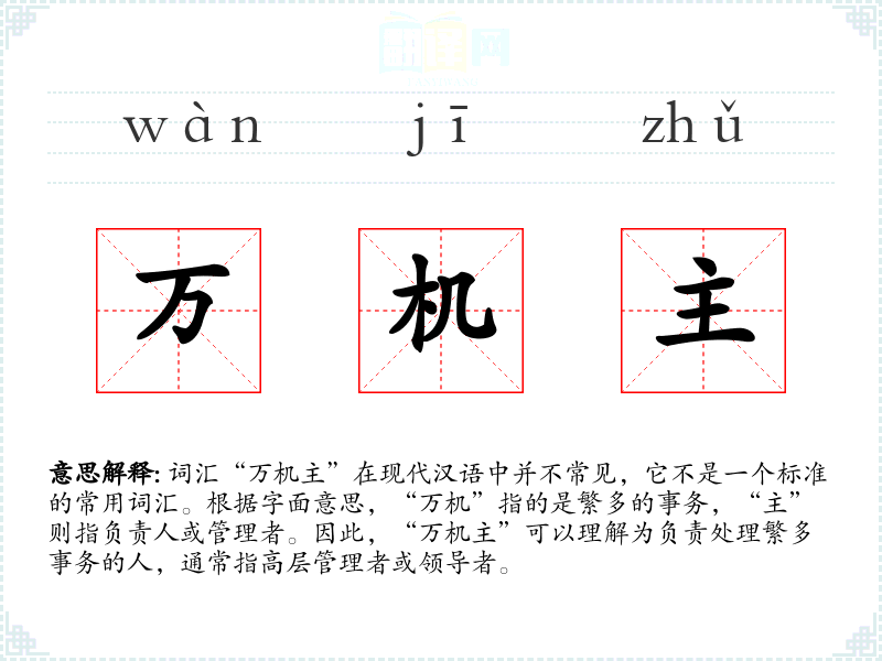 词汇“万机主”在现代汉语中并不常见,它不是一个标准的常用词汇。根据字面意思,“万机”指的是繁多的事务,“主”则指负责人或管理者。因此,“万机主”可以理解为负责处理繁多事务的人,通常指高层管理者或领导者。
