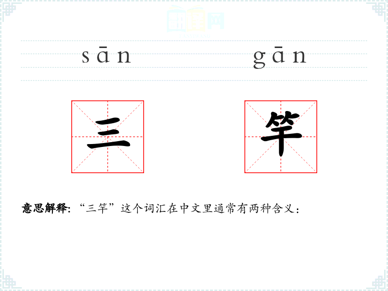 - 字面意思:指的是三根竿子,可能是指具体的三根竹竿、木竿等。