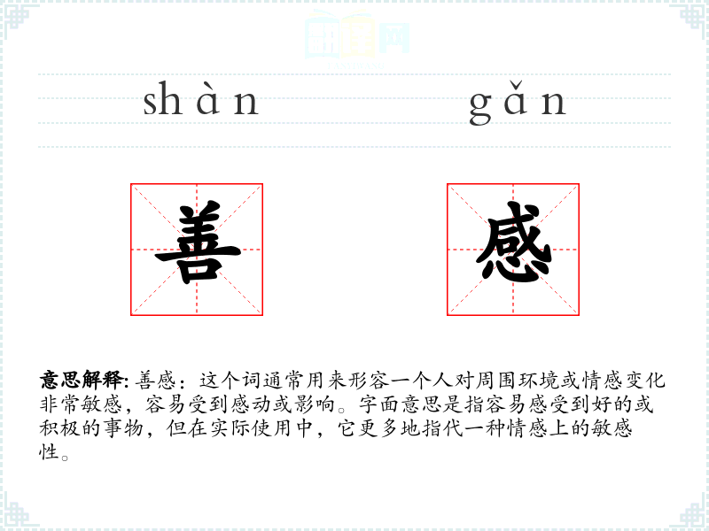 善感:这个词通常用来形容一个人对周围环境或情感变化非常敏感,容易受到感动或影响。字面意思是指容易感受到好的或积极的事物,但在实际使用中,它更多地指代一种情感上的敏感性。