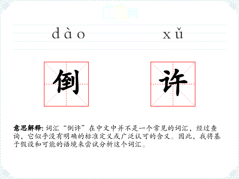 词汇“倒许”在中文中并不是一个常见的词汇,经过查询,它似乎没有明确的标准定义或广泛认可的含义。因此,我将基于假设和可能的语境来尝试分析这个词汇。