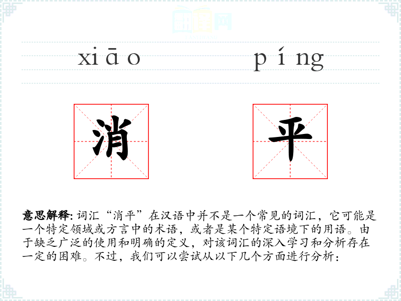 词汇“消平”在汉语中并不是一个常见的词汇,它可能是一个特定领域或方言中的术语,或者是某个特定语境下的用语。由于缺乏广泛的使用和明确的定义,对该词汇的深入学习和分析存在一定的困难。不过,我们可以尝试从以下几个方面进行分析: