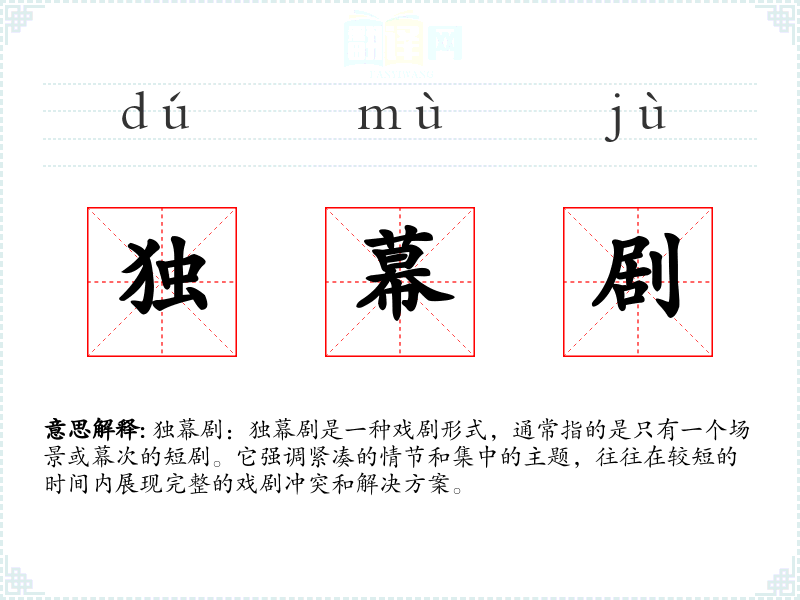 同义词:短剧、单幕剧 反义词:多幕剧、长剧