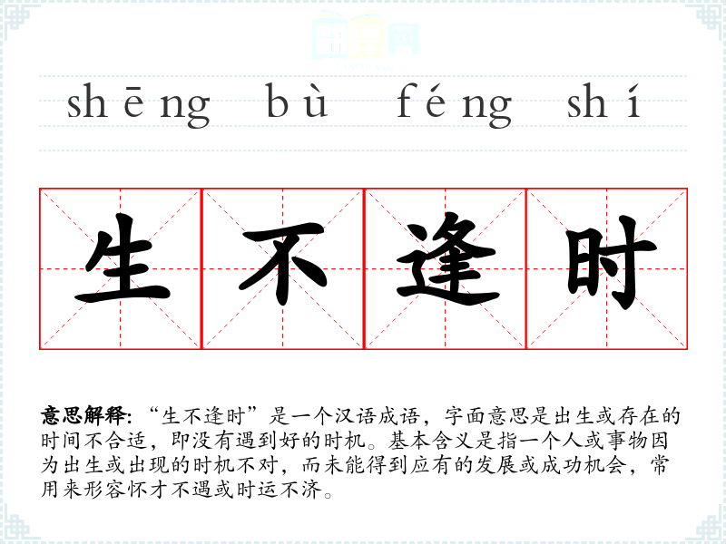 “生不逢时”是一个汉语成语,字面意思是出生或存在的时间不合适,即没有遇到好的时机。基本含义是指一个人或事物因为出生或出现的时机不对,而未能得到应有的发展或成功机会,常用来形容怀才不遇或时运不济。