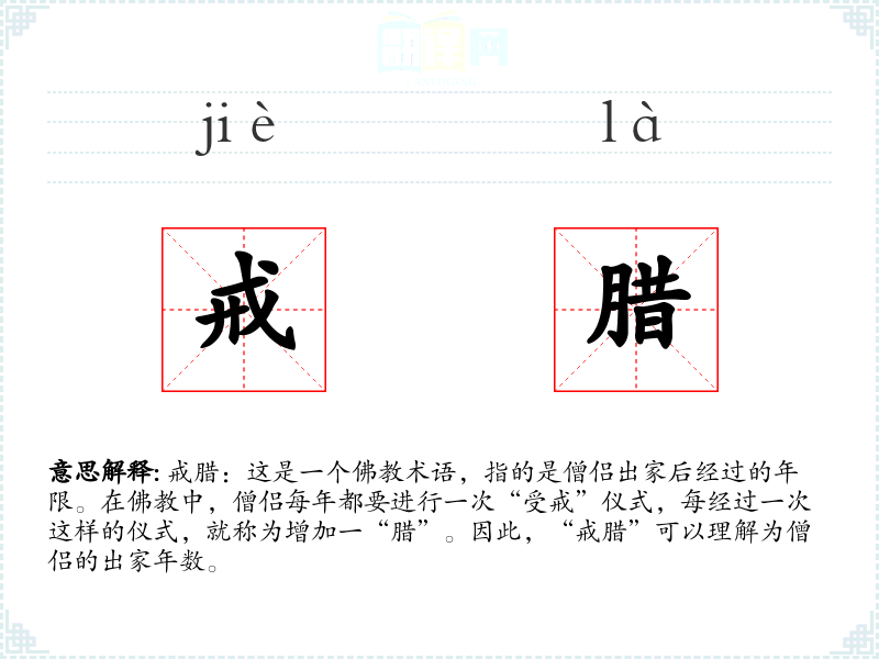 戒腊:这是一个术语,指的是僧侣出家后经过的年限。在中,僧侣每年都要进行一次“受戒”仪式,每经过一次这样的仪式,就称为增加一“腊”。因此,“戒腊”可以理解为僧侣的出家年数。