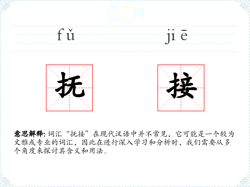 词汇“抚接”在现代汉语中并不常见,它可能是一个较为文雅或专业的词汇,因此在进行深入学*和分析时,我们需要从多个角度来探讨其含义和用法。