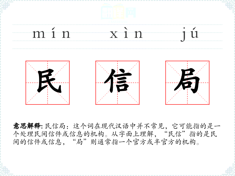 民信局:这个词在现代汉语中并不常见,它可能指的是一个处理民间信件或信息的机构。从字面上理解,“民信”指的是民间的信件或信息,“局”则通常指一个官方或半官方的机构。